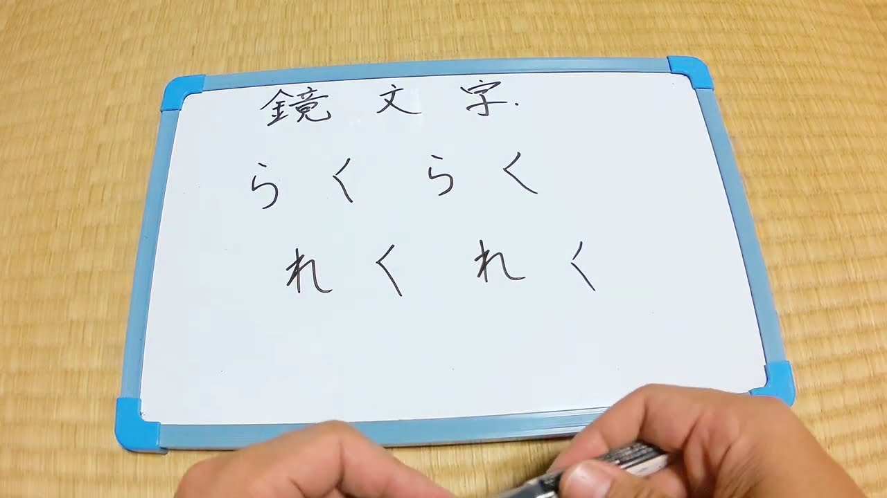 左右反対に字を書くだけのカンタンな遊びです。書く手もいつもとは反対の手で書いています。らくらくれくれく